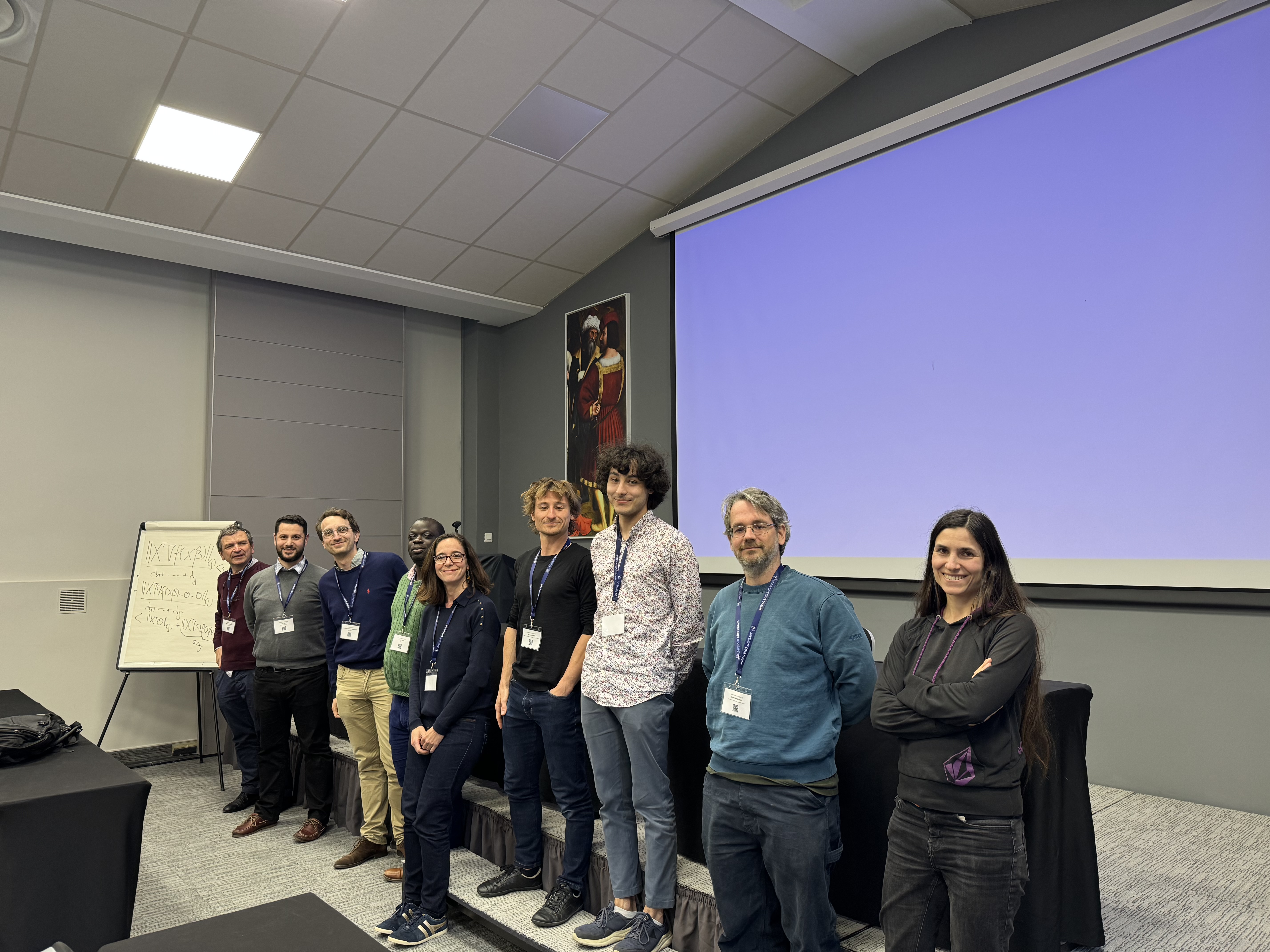 – Nice (18-20 mars 2026). Journées précédées d’un mini-cours sur le thème Performance Estimation Problems assuré par Aymeric Dieuleveut (École Polytechnique) et Adrien Taylor (Inria) à Nice organisé en collaboration avec le RT Optimisation. Photos du groupe : Photo 1 ; Photo 2. Remise du prix Dodu et du prix poster ici.